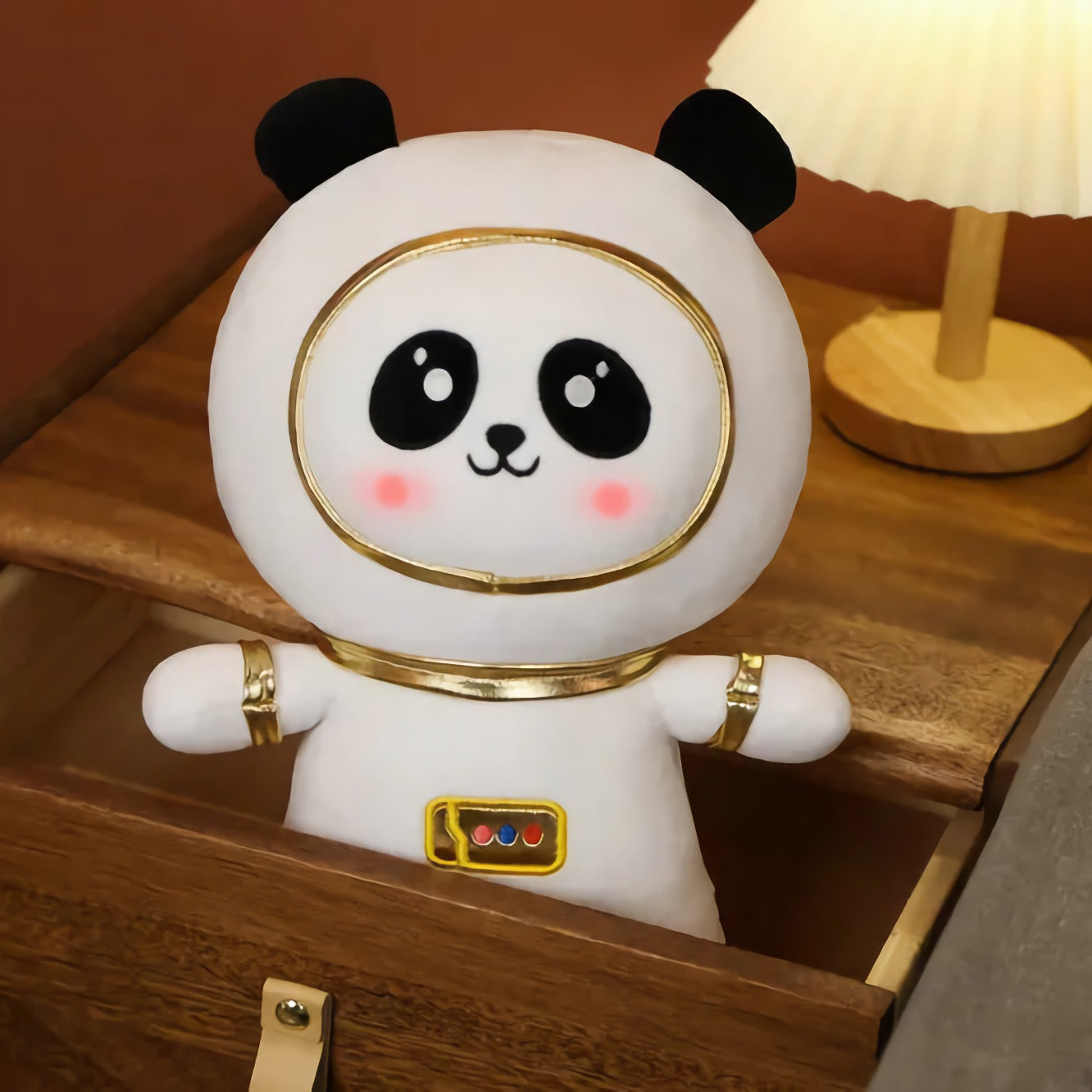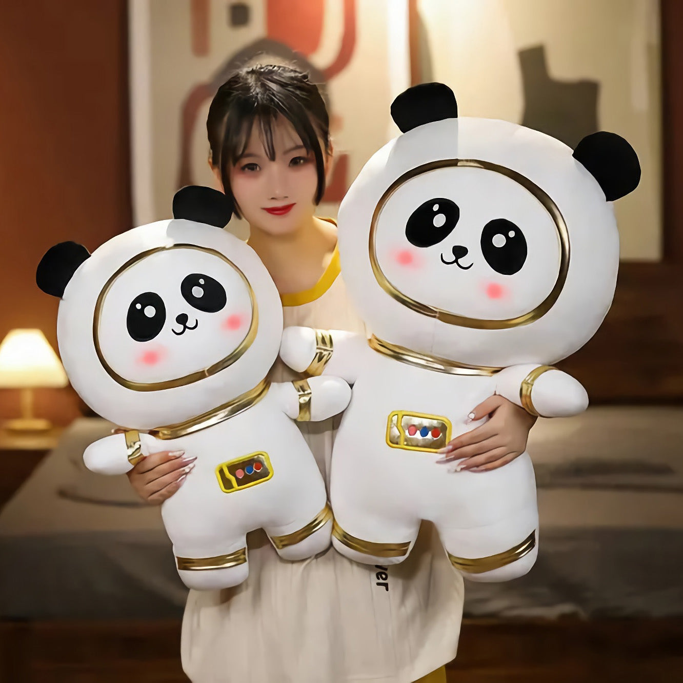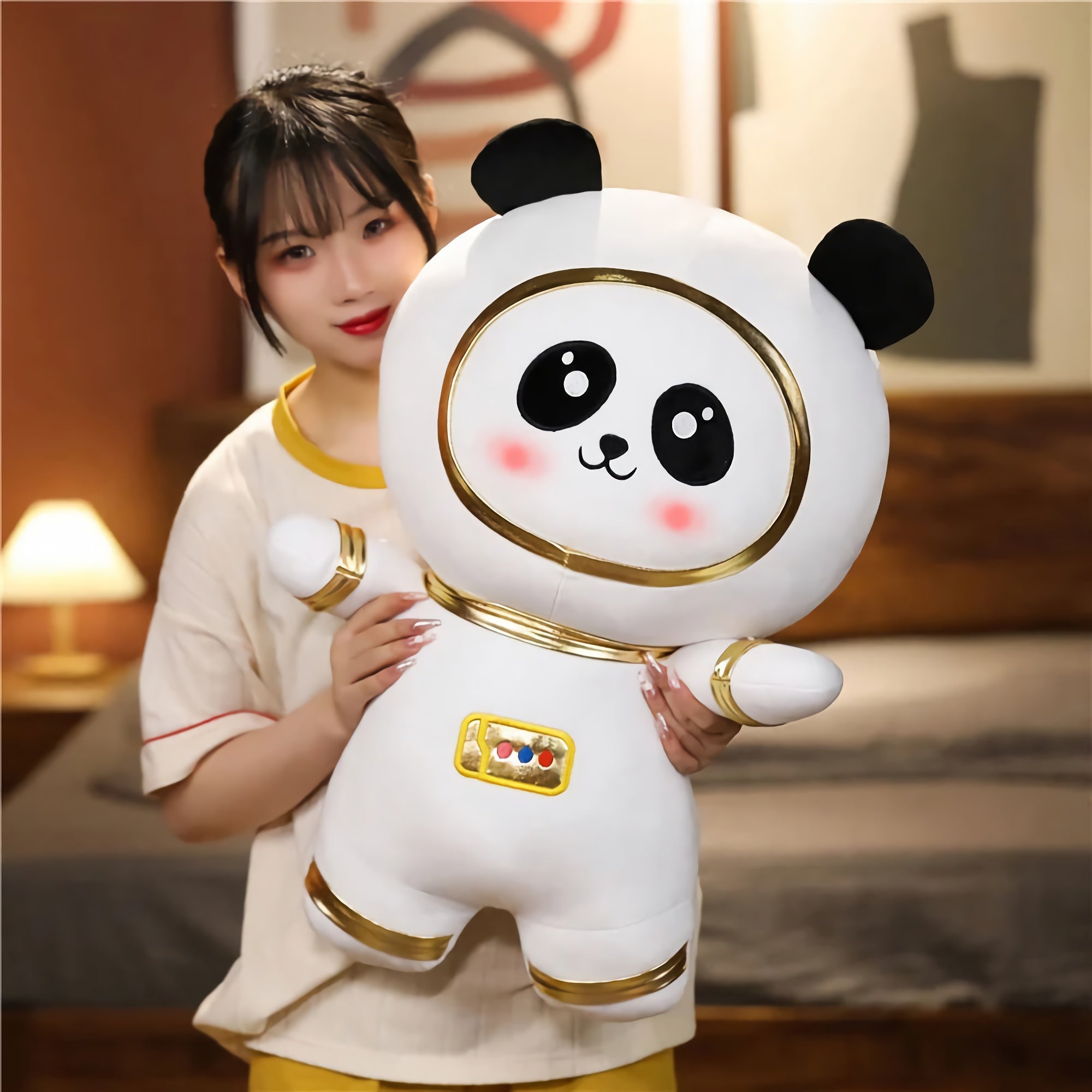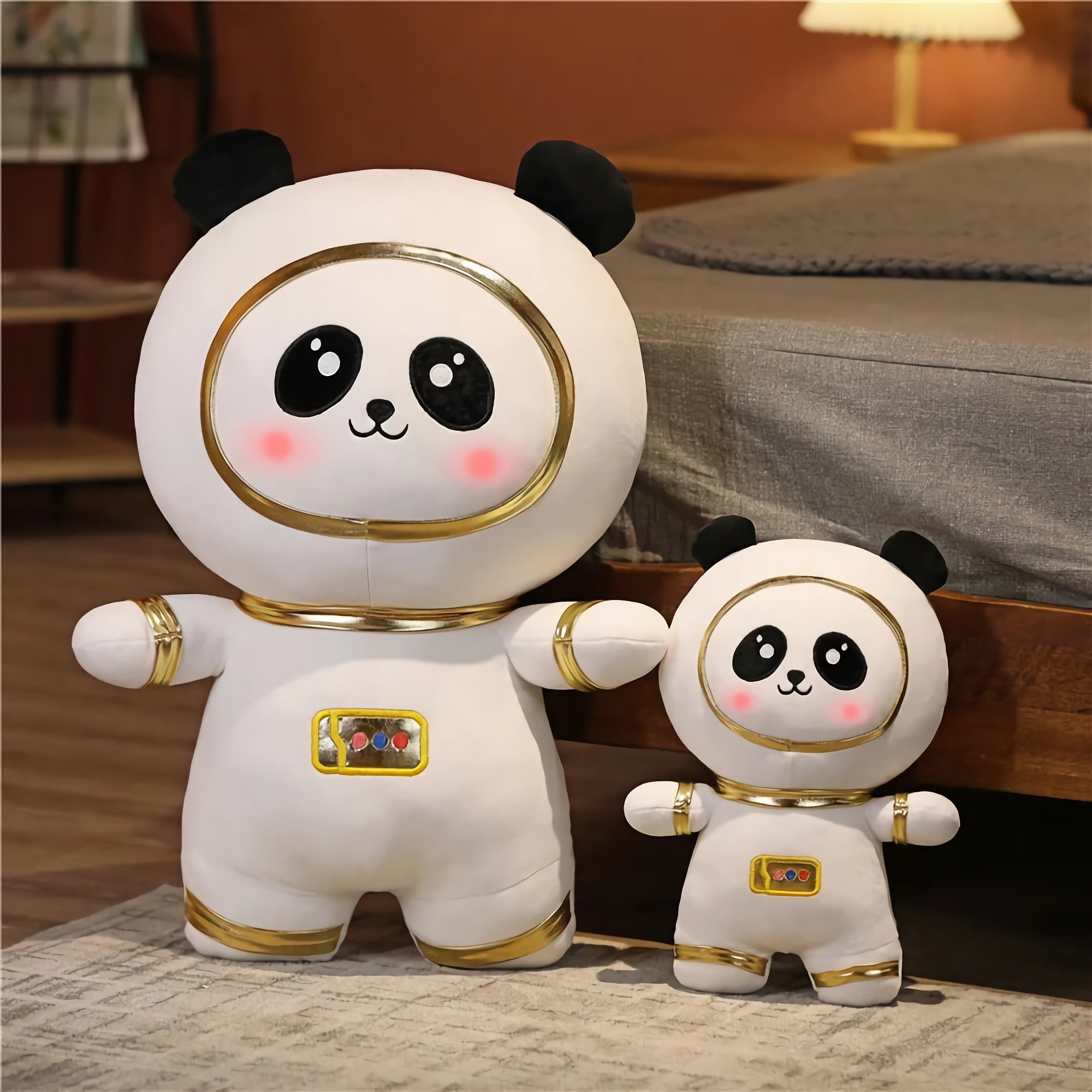 🐼✨ Meet the Cosmic Cuddle Panda - your new intergalactic cuddle buddy! Dressed in a shimmering gold-trimmed spacesuit with an expression that’s as dreamy as the stars, this astronaut panda plushie is ready to orbit your heart. Whether they're on a space mission to the couch or the bed, they bring universal comfort and cuteness.