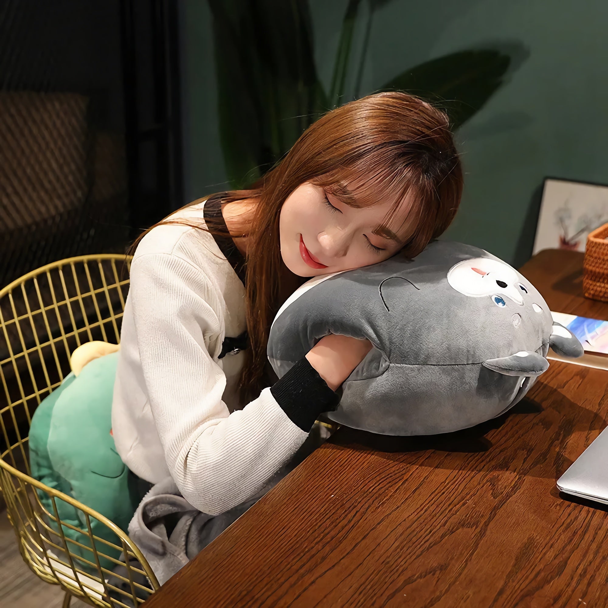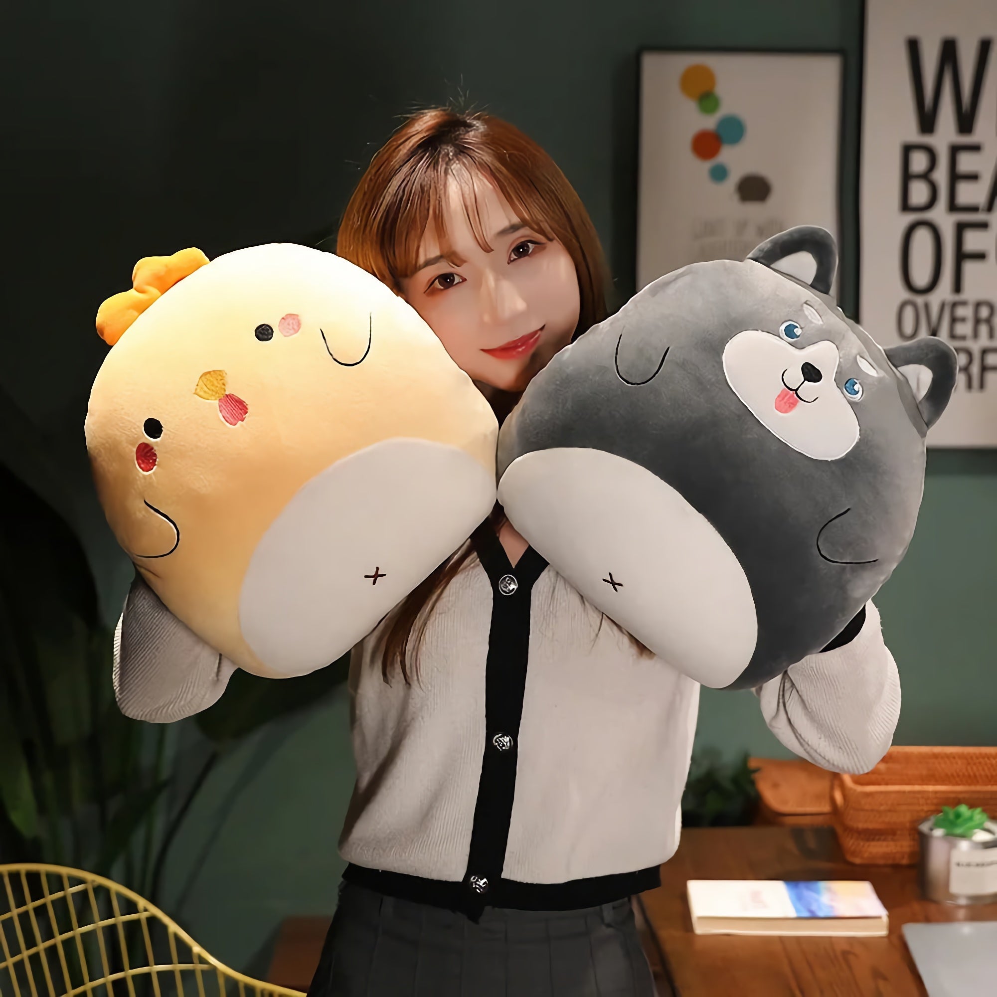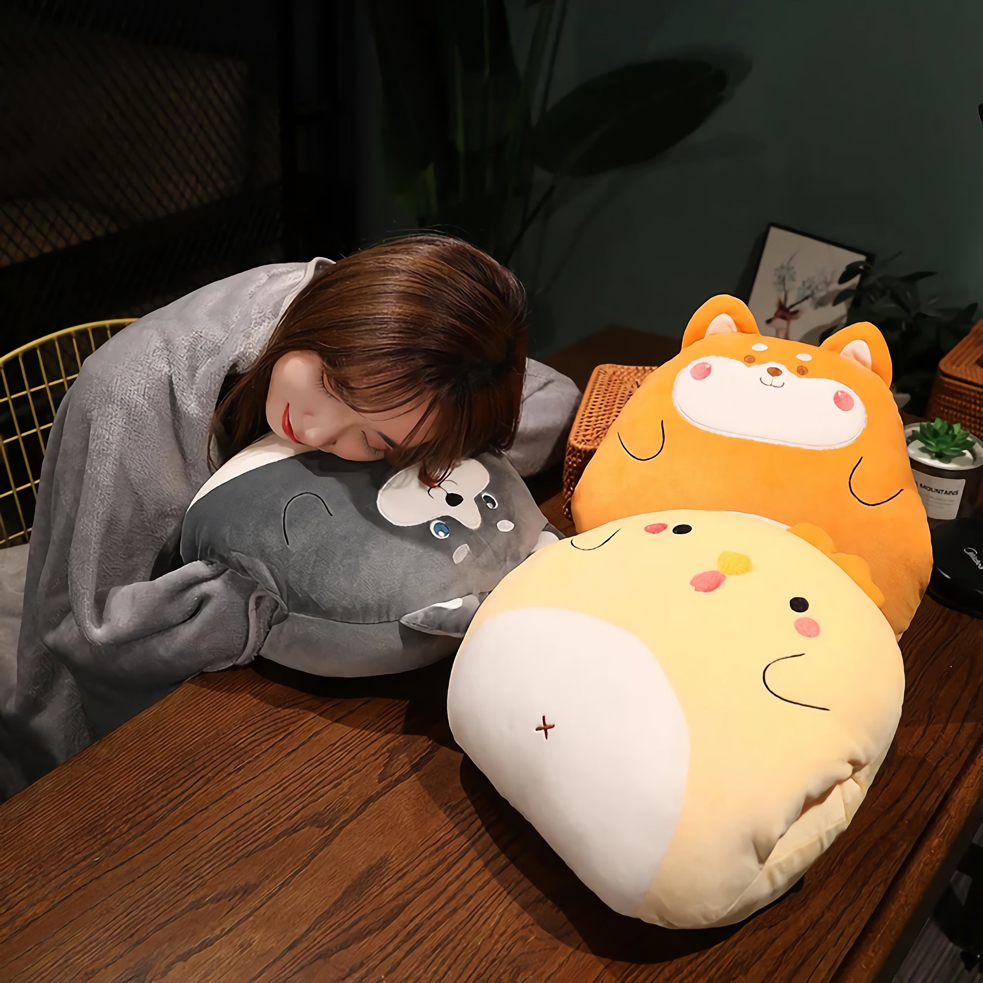 🐾 Meet the Chubby Critter Cuddle Set! This ultra-soft, round plushie is more than just an adorable face - it’s a 3-in-1 comfort essential! Use it as a pillow, unzip it for a warm, cozy blanket, and slide your hands inside to warm your hands for extra toasty snuggles. Whether you're lounging at home, working at your desk, or need a travel companion, these fluffy animal buddies are here to keep you warm and comfy.